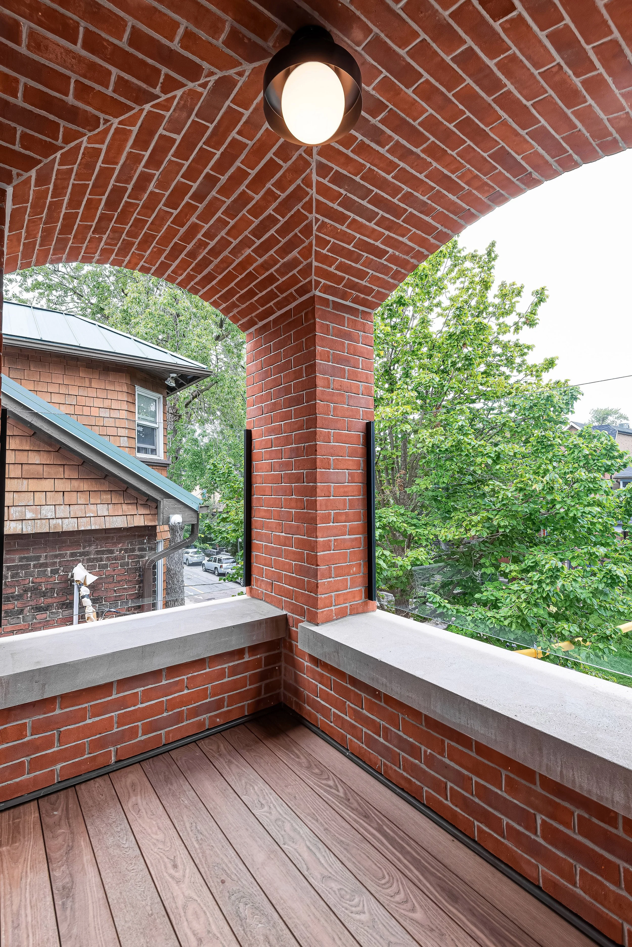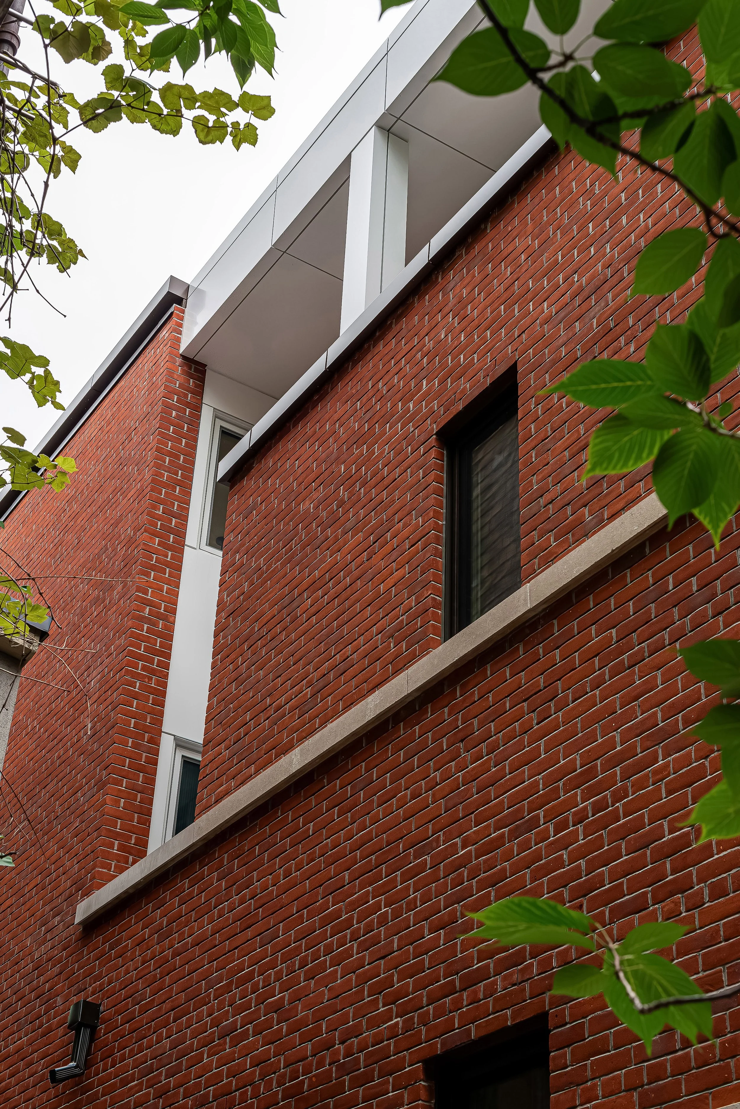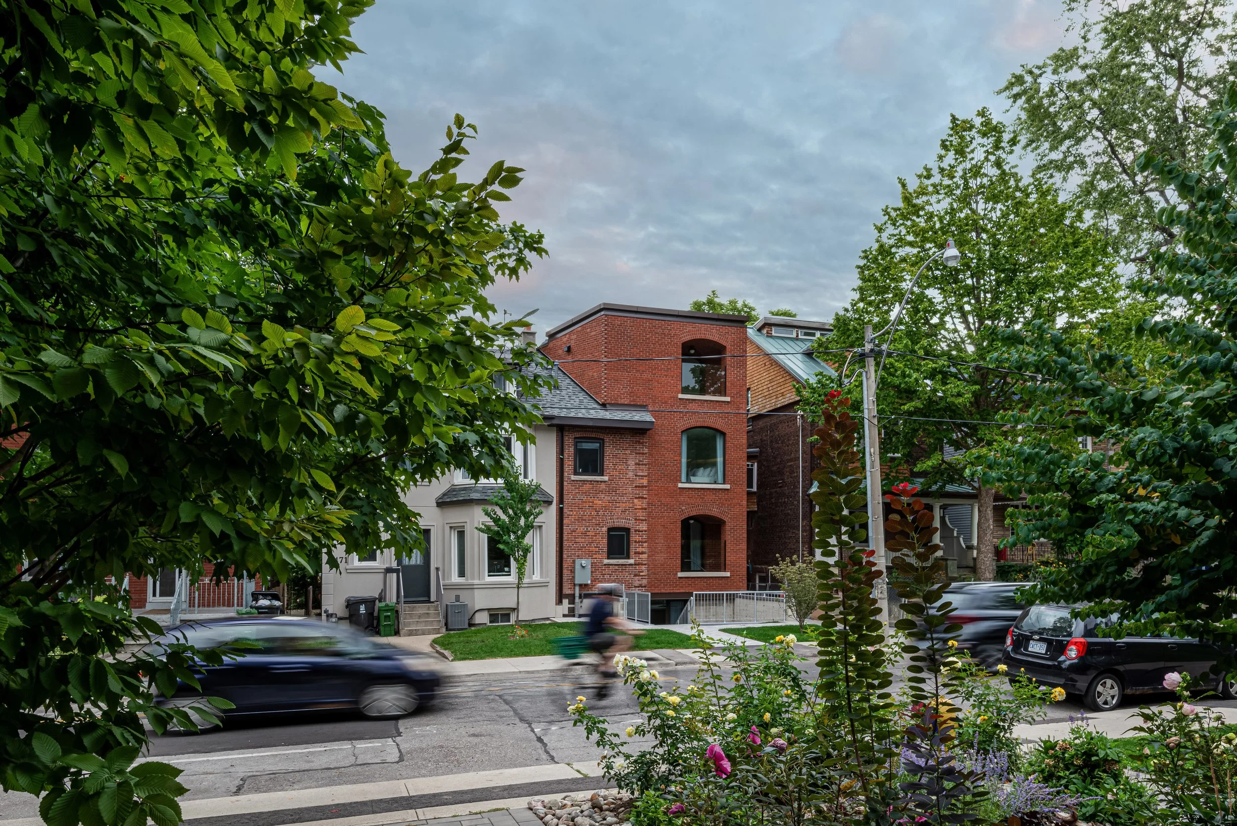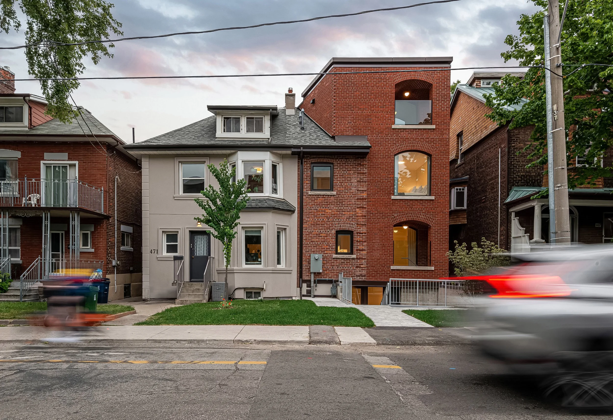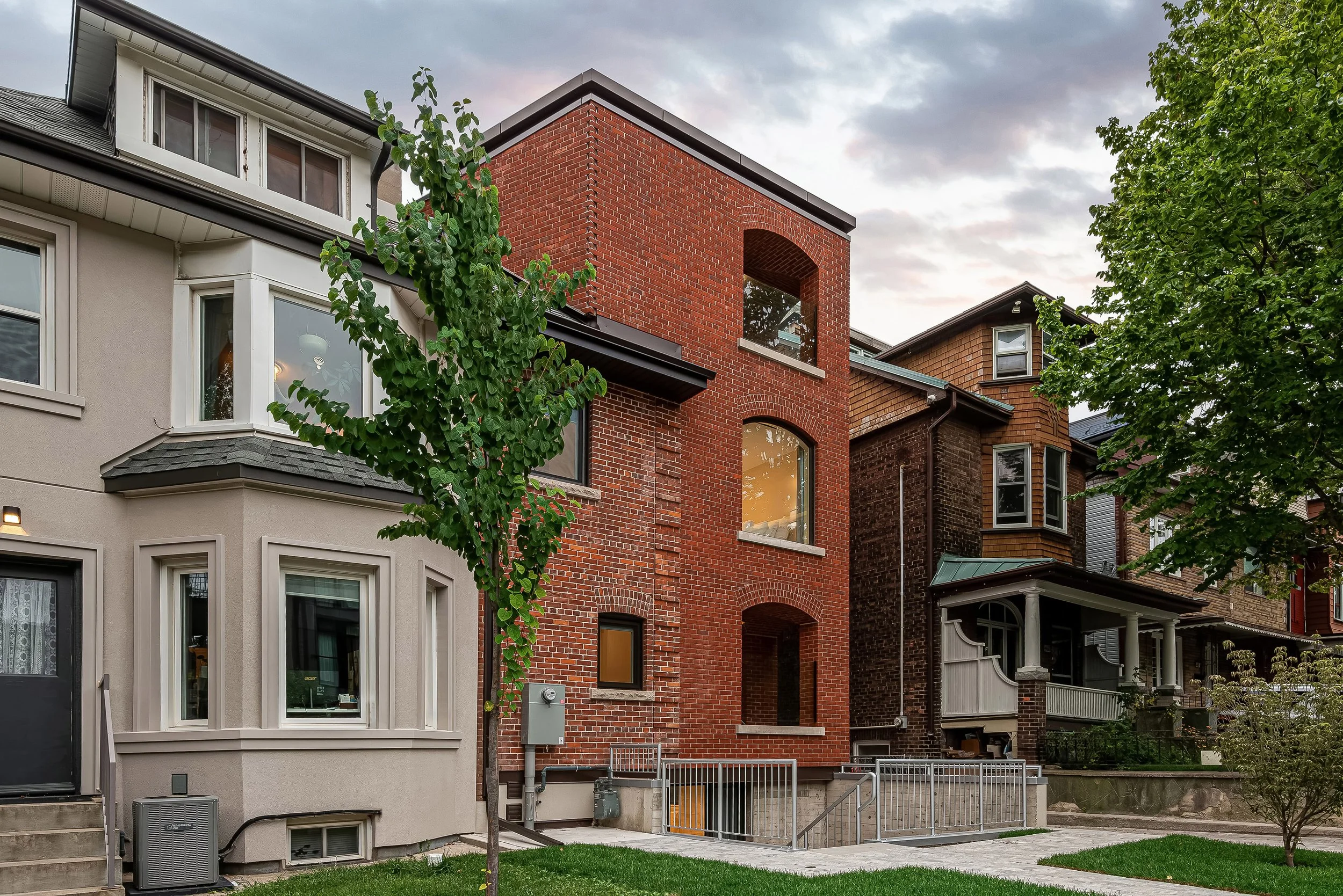 We transformed a semi-detached two-and-a-half-story Edwardian home into a fourplex walk-up apartment with two family-sized units and two bachelor units. The architecture honors the existing neighborhood streetscape while introducing a modified walk-up apartment typology, blending seamlessly into the community of brick century houses.